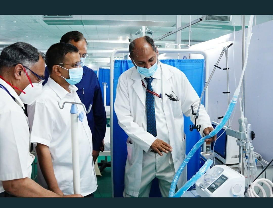 今年5月中,德里首席部长阿文德‧凯杰里瓦尔(Arvind Kejriwal;下方图片左二)到访兰米拉·迈丹(Ramlila Maidan)新冠病毒治疗设施,了解本集团旗下品牌inspiredTM O2FLO呼吸湿化治疗仪,此仪器为能够自主呼吸的患者提供高流速空氧混合加热湿化气体。